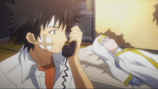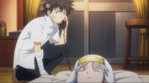 Because the only thing more interesting than watching a five minute phone conversation is watching Touma embark on a telemarketing campaign to save Index without paying attention to the time. Thankfully, once the telemarketing was over, things picked up a little bit, but unfortunately, that was the entire first half of the episode, and even more unfortunately, it still remained rather boring and he spent another 2-3 minutes on the phone and soliloquizing before deciding to "become a hero" and attempt to use his magic nullification to… stick his finger in Index’s mouth. That’s actually the point where things got interesting again though, so I can’t really complain about the weirdness there too much. It’s just a shame that it happened 21 minutes into the episode instead of 2 minutes into the episode.