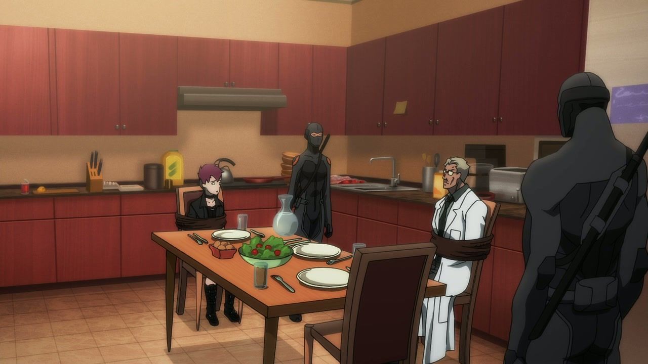 The ninjas/ninja man-bats are also what keeps any of the action from being particularly interesting. It’s always just beating up grunts or Damian being the greatest, most unstoppable, specialest boy wonder ever. The animation is more than sufficient, but it’s not well directed and never builds up any tension. The splashes of jam as ‘blood’ are also about as effective as Brynhildr’s attempts to throw preserves around the screen and call that gory. Even when it does things like stabbing both Damian’s arms to a wall, he just rips the knife through them and goes right back to fighting. Broken arm? Still just as strong as Slade! It’s impossible to get into it when I have to shake my head at how ridiculous it is every 30 seconds. Â