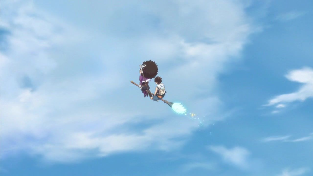 It's not Jump, but it's certainly trying to be. Hell if I know why. I suppose I don't remember seeing too many speedlines or stills. Is that something? We can call it a win. For as uninspired a setting as it is, it takes its sweet time explaining directly to the audience all about the existence of monster and racism, and then re-explains it. Meanwhile, the characters are all blithering imbeciles. "That's a monster! Get away from it!" "Oh, you mean spend the next two minutes crowding even closer?" "It's a monster!" "A monster!?" My god, that scene was astonishing even in a sea of stupidity. And then an old dude dressed like a pro wrestler from the 80s flew in on a broom shooting lasers, leading to the gasping cliffhanger that he's a wizard too. They even had to explicitly announce that. Twice.