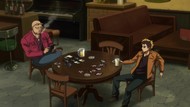 Plus, to continue harping on about the animation, that's still sucking too. Fighting a giant mutant zombie panda absolutely could've at least looked decent, but two slashes and it falls over while Handsy Man and Kid Bat wander off. What was even the point of that kid while we're at it? Some future nonsense, no doubt, but we're already lacking in the present, and I somehow doubt that whatever Handsy Man's backstory/relationship is with the kid is going to be compelling enough for this to have been strung out like it is.