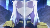 Better constructed than the other show's big fight, but Passione's A game on animation is still mediocre at best. Can't believe I'd be missing Seven Arcs half-assing the first season, but at least neither side just stood there and emitted vortexes or explosions while repeatedly announcing that they intend to fight. Also not surprising that she lives on in fanservice mindspace, now with extra fanservice. There definitely needed to be a reason why he's decided to suddenly start hiding her instead telling everybody like usual, above and beyond "for the T&A."