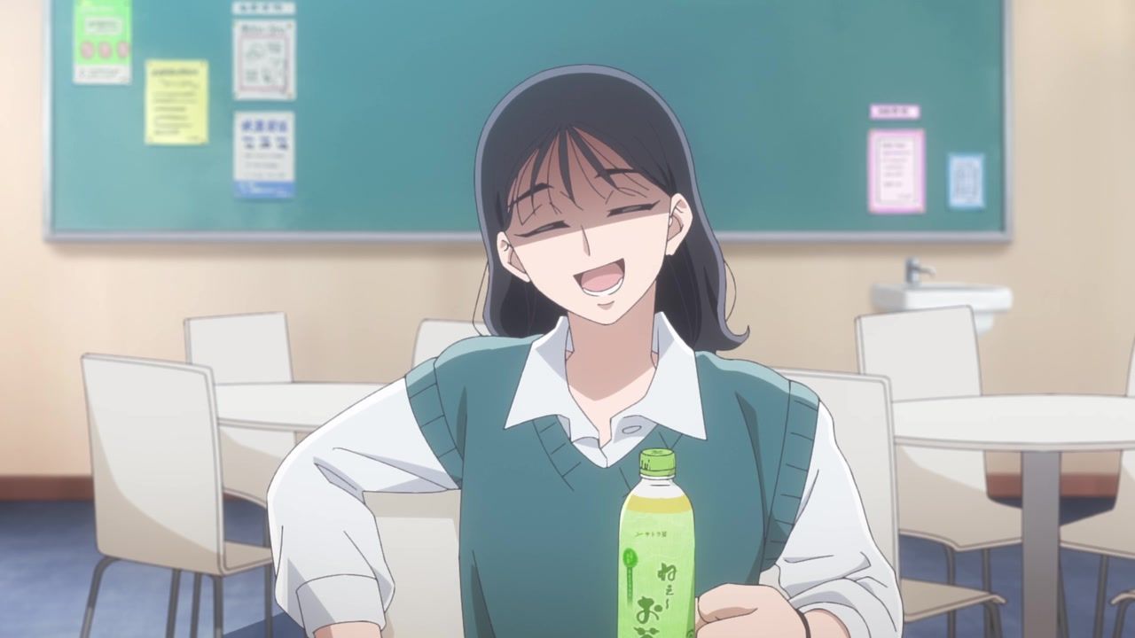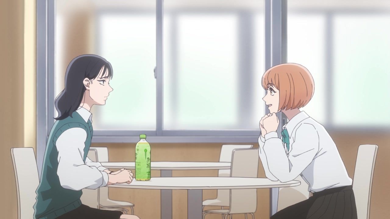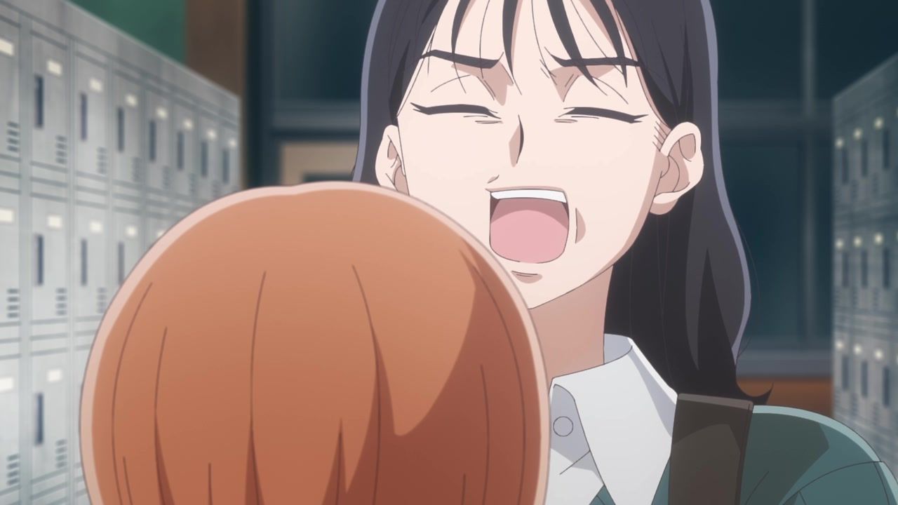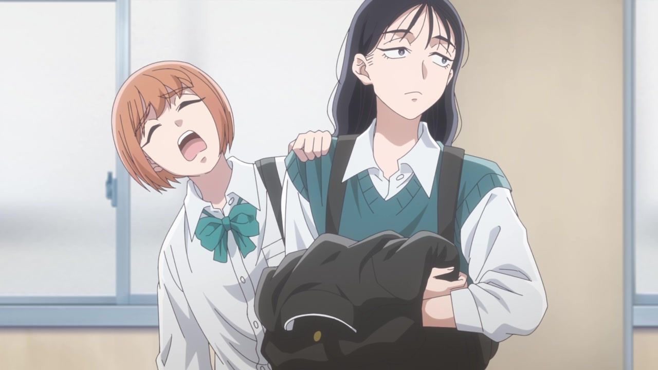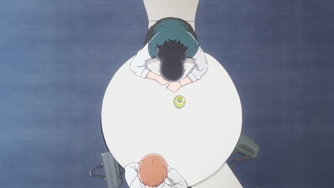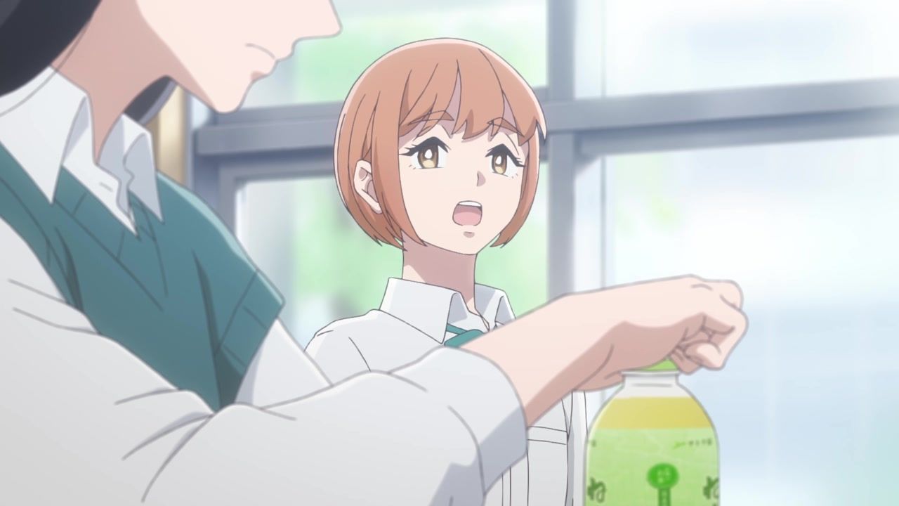 I think the animators might've been a bit bored. The opening is full of surreality, visual flair, and general nonsense. And then the actual episode itself is 20 minutes of two girls doing manzai. Did they fire everybody who worked on the opening as soon as it was done? Very rarely, it seems to almost remember that other forms of comedy can exist, like when the dude goes for a kiss and sticks his tongue entirely out like a frog, but it's not even clear to me that the animators realized that could be funny. You can tell when they think a joke has been made by the characters overreacting, but that had a deadpan internal narration about how great friendship was running over the whole thing. So it wasn't a joke? It was girl power? If you say so.