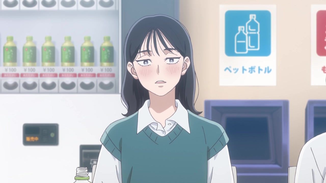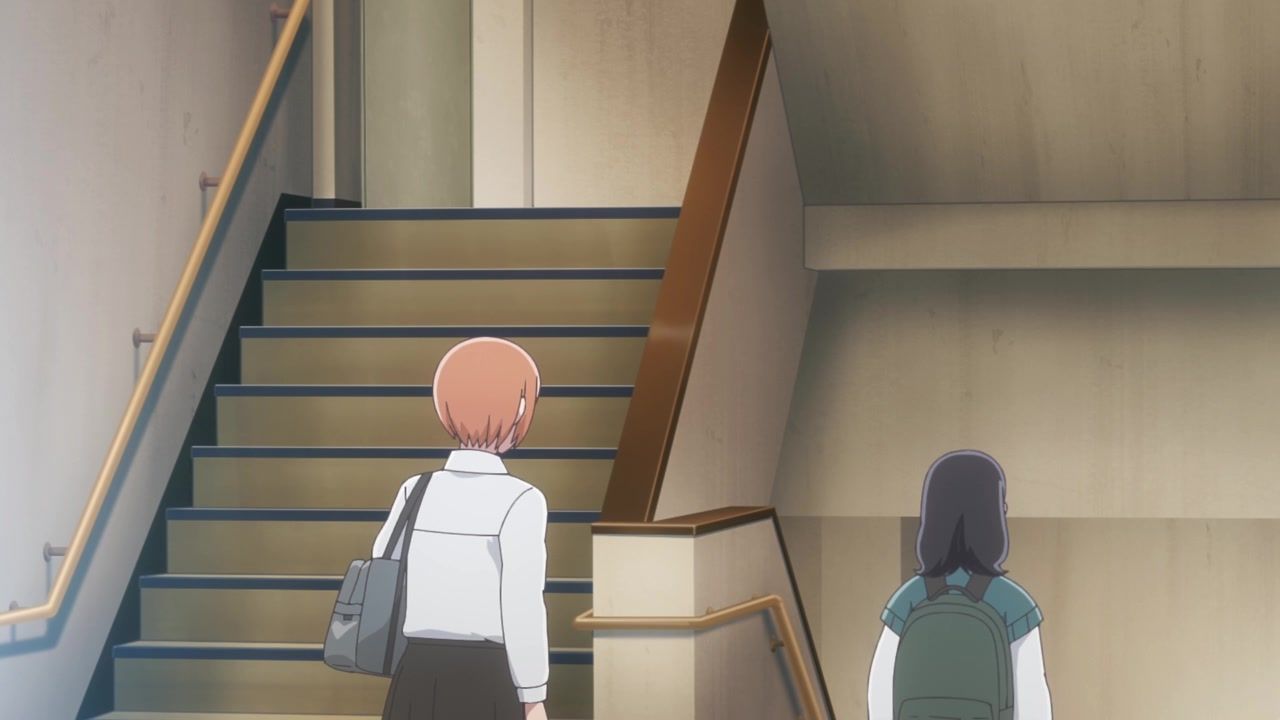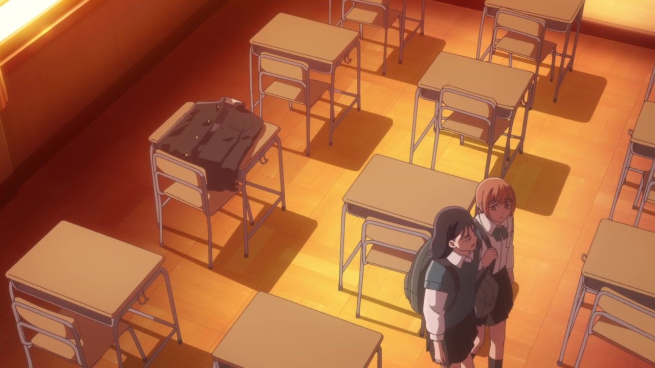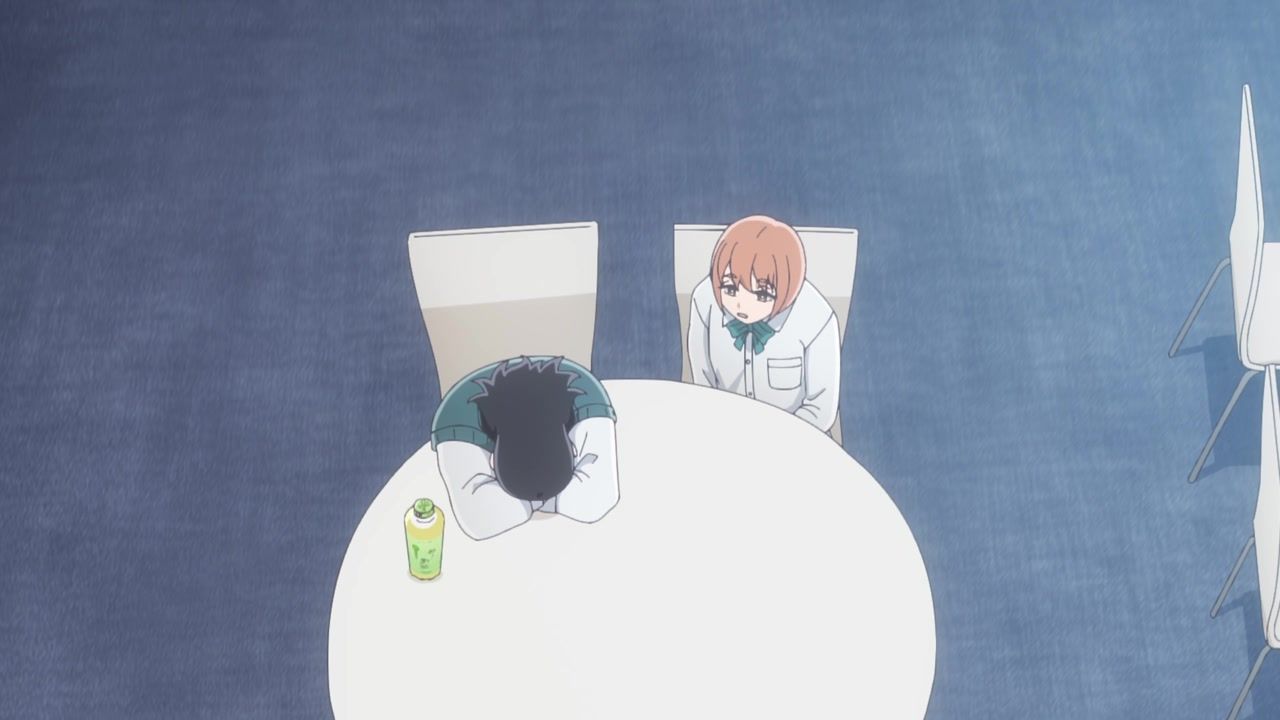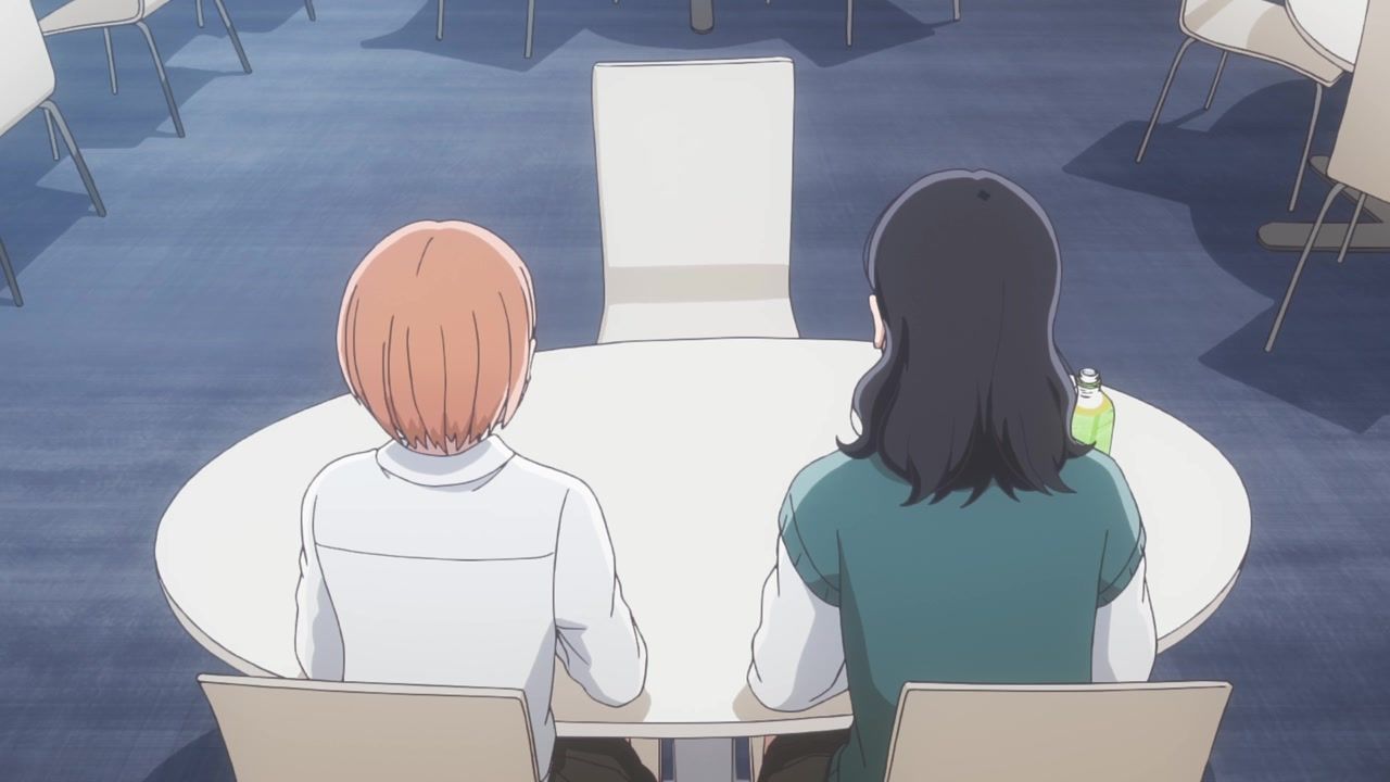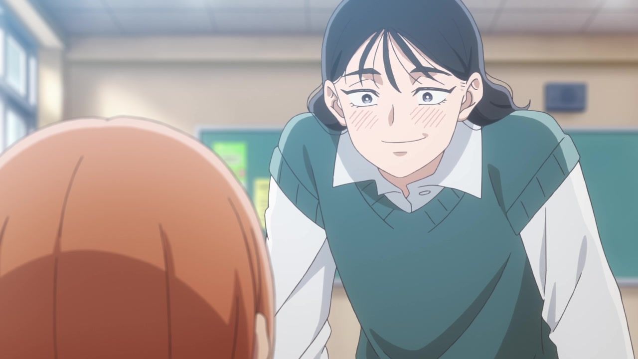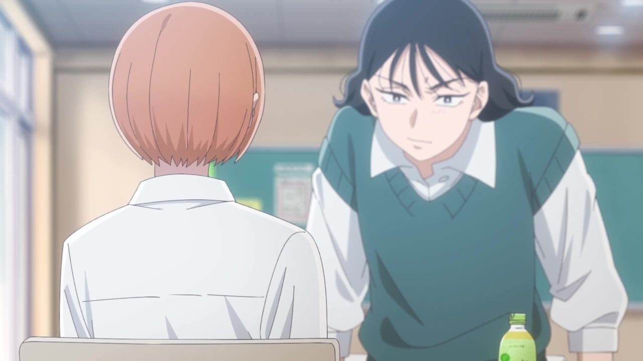 I think the animators might've been a bit bored. The opening is full of surreality, visual flair, and general nonsense. And then the actual episode itself is 20 minutes of two girls doing manzai. Did they fire everybody who worked on the opening as soon as it was done? Very rarely, it seems to almost remember that other forms of comedy can exist, like when the dude goes for a kiss and sticks his tongue entirely out like a frog, but it's not even clear to me that the animators realized that could be funny. You can tell when they think a joke has been made by the characters overreacting, but that had a deadpan internal narration about how great friendship was running over the whole thing. So it wasn't a joke? It was girl power? If you say so.