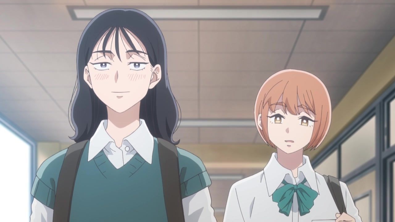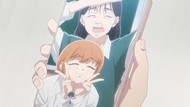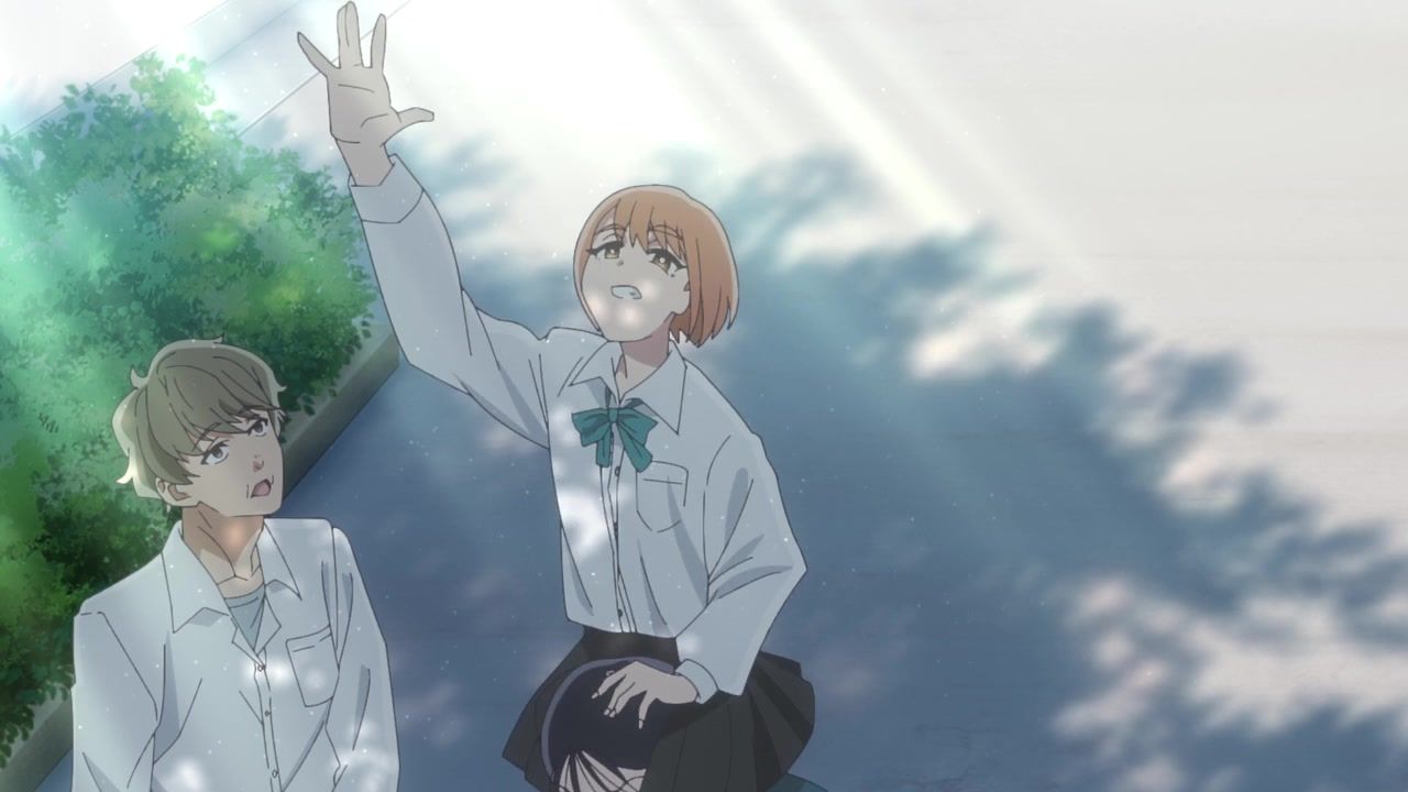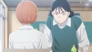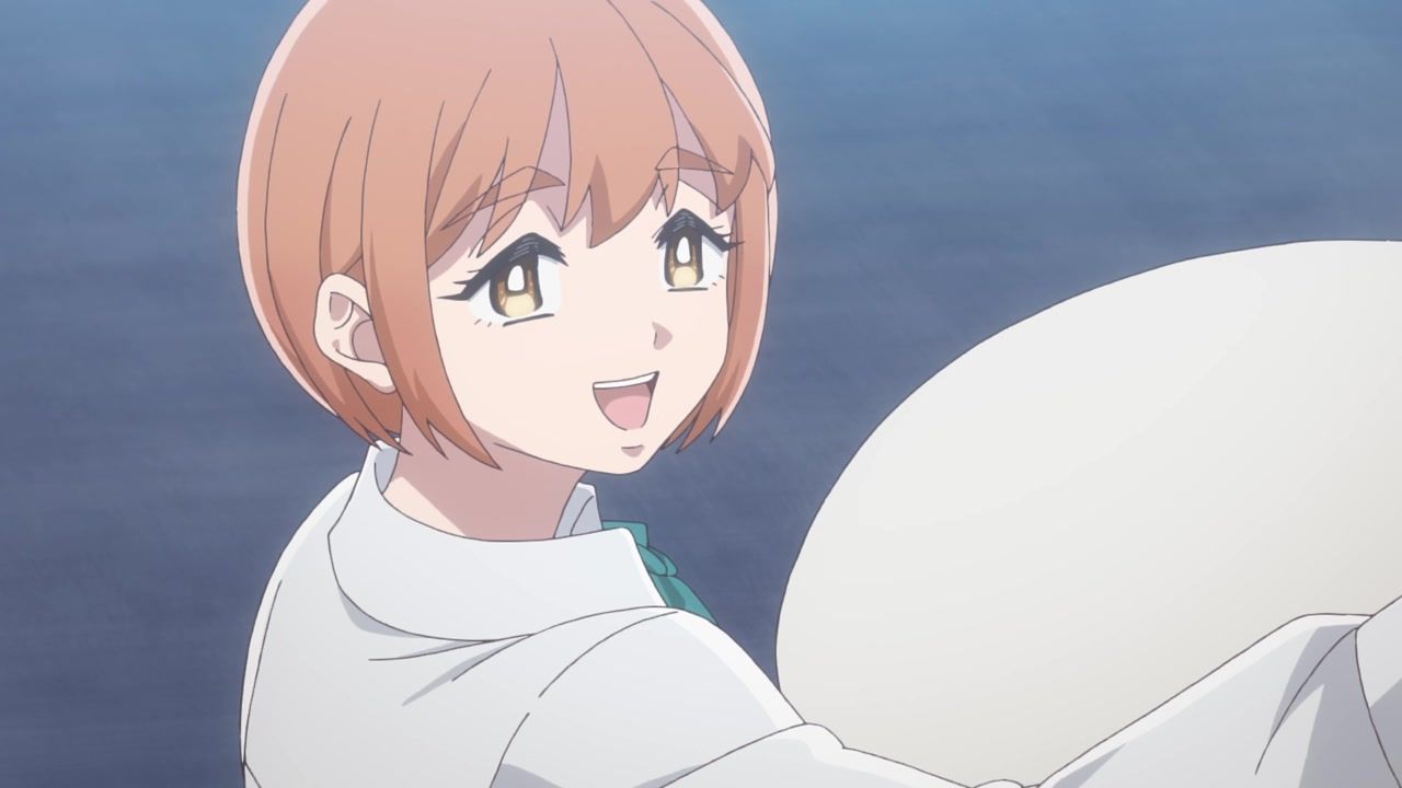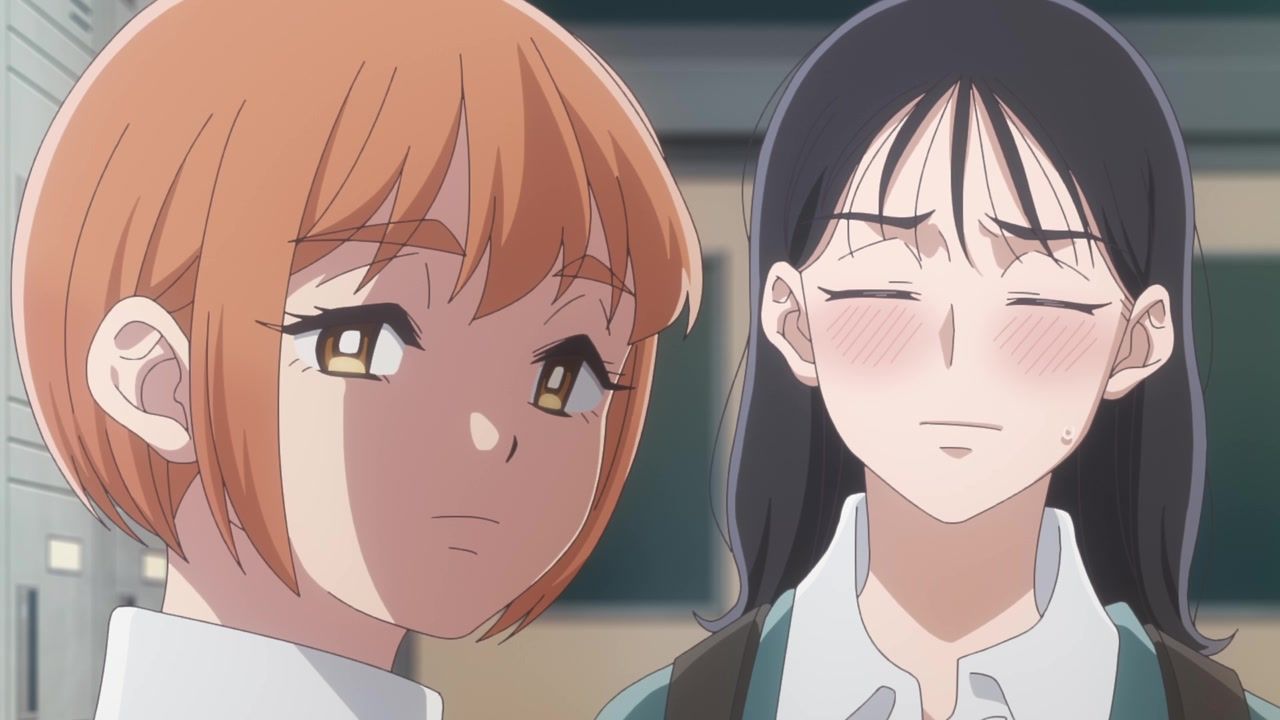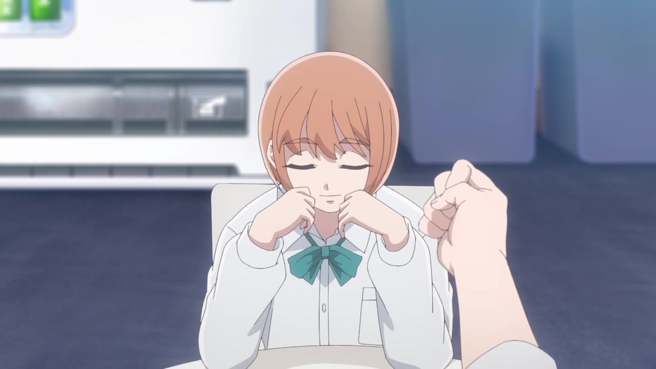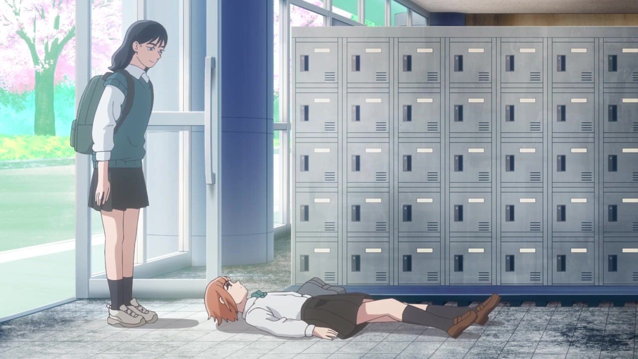 I think the animators might've been a bit bored. The opening is full of surreality, visual flair, and general nonsense. And then the actual episode itself is 20 minutes of two girls doing manzai. Did they fire everybody who worked on the opening as soon as it was done? Very rarely, it seems to almost remember that other forms of comedy can exist, like when the dude goes for a kiss and sticks his tongue entirely out like a frog, but it's not even clear to me that the animators realized that could be funny. You can tell when they think a joke has been made by the characters overreacting, but that had a deadpan internal narration about how great friendship was running over the whole thing. So it wasn't a joke? It was girl power? If you say so.