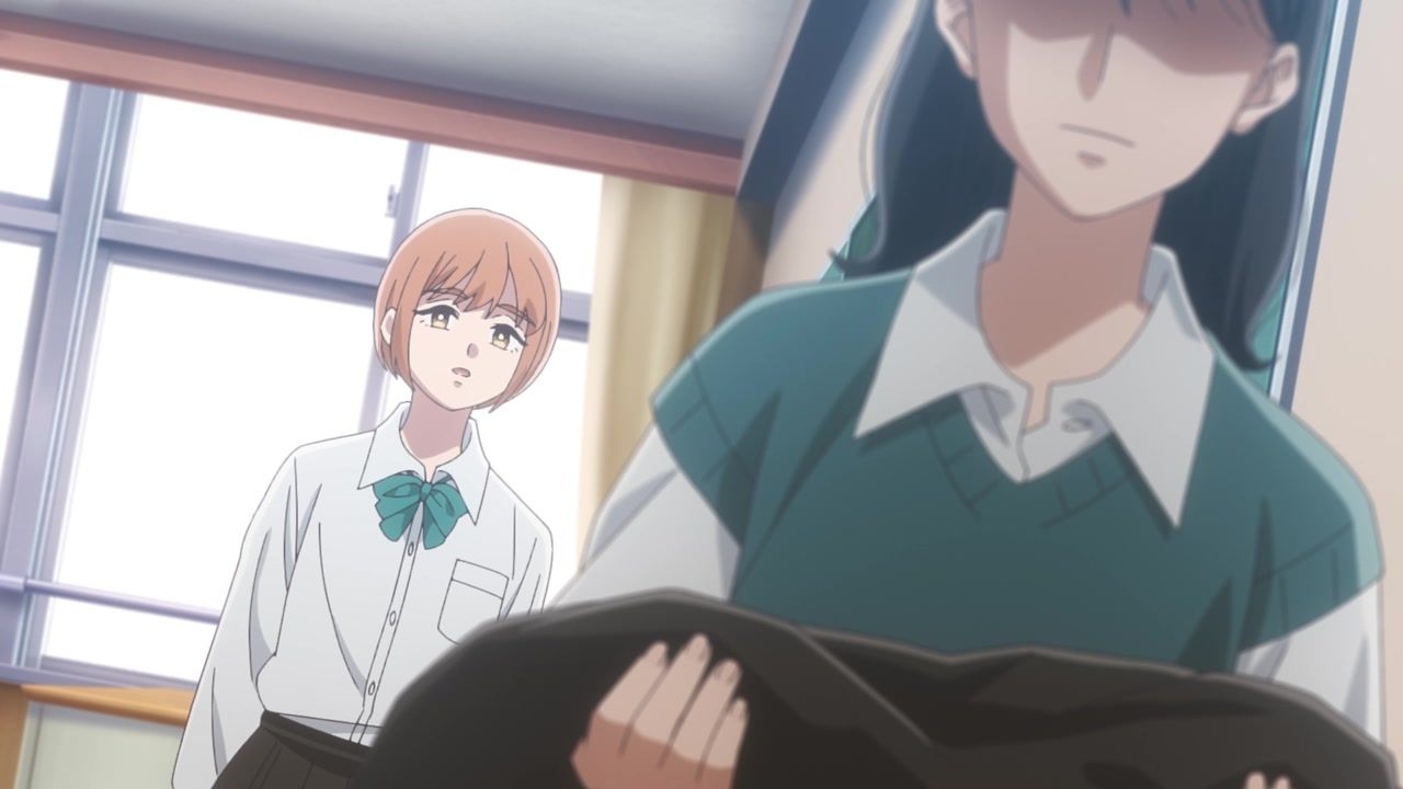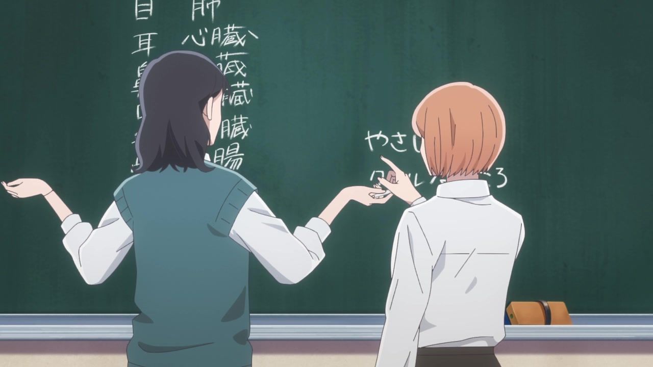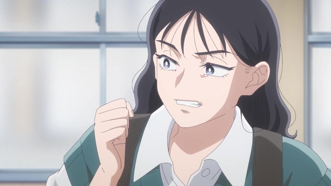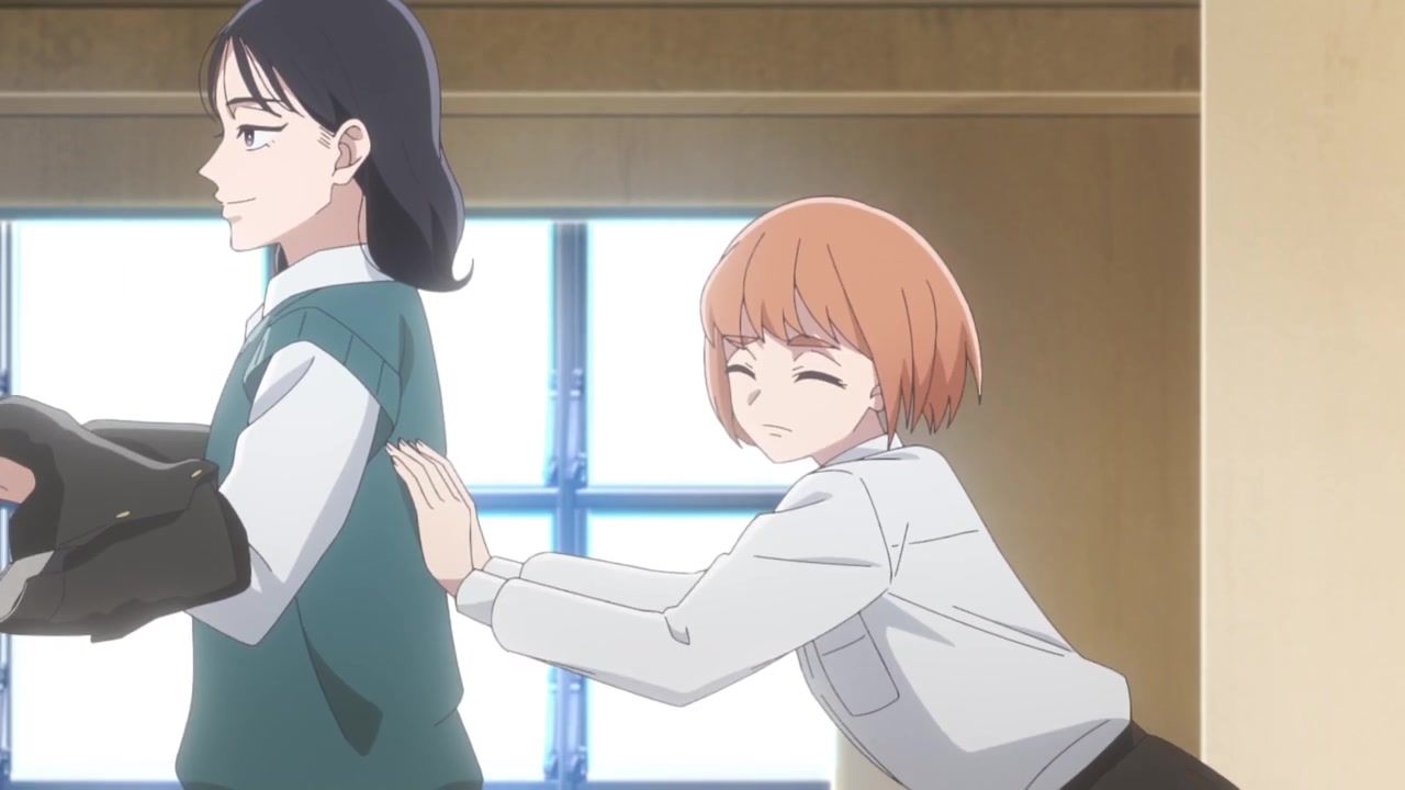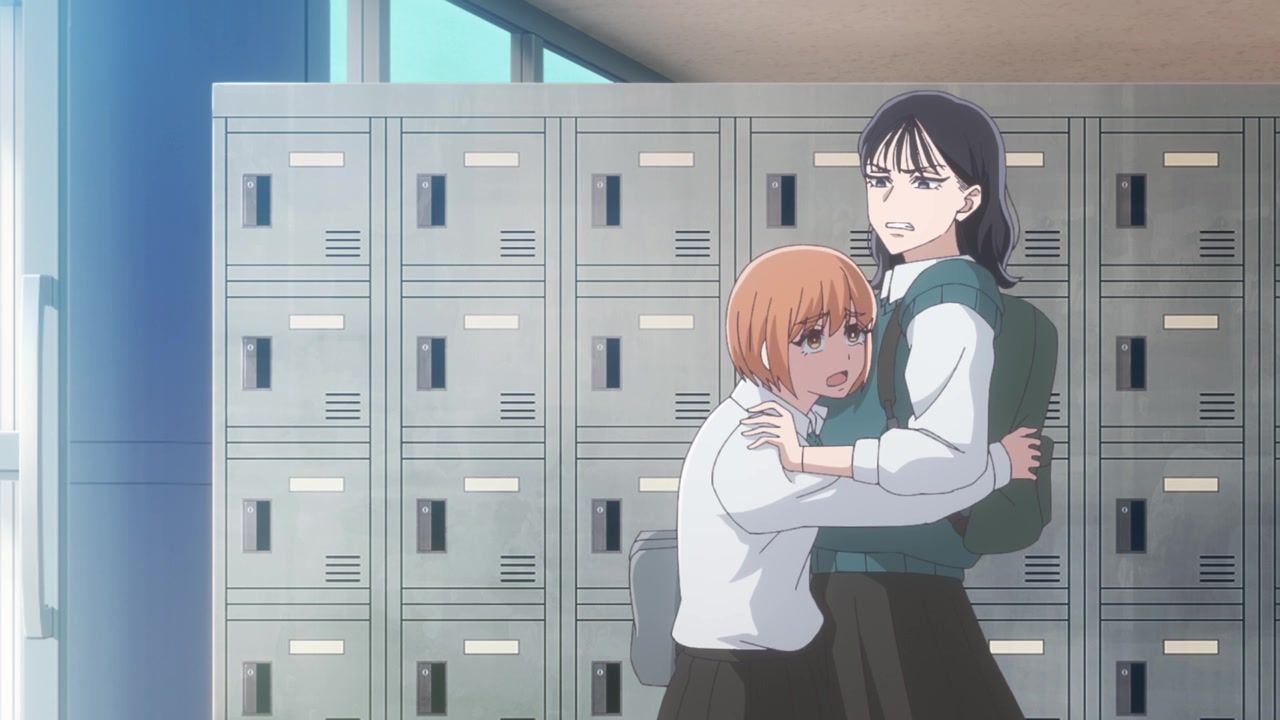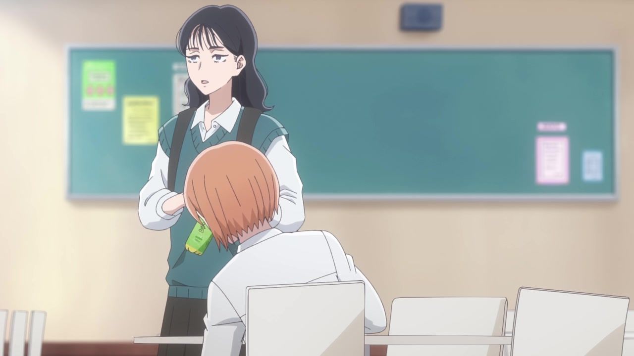 I think the animators might've been a bit bored. The opening is full of surreality, visual flair, and general nonsense. And then the actual episode itself is 20 minutes of two girls doing manzai. Did they fire everybody who worked on the opening as soon as it was done? Very rarely, it seems to almost remember that other forms of comedy can exist, like when the dude goes for a kiss and sticks his tongue entirely out like a frog, but it's not even clear to me that the animators realized that could be funny. You can tell when they think a joke has been made by the characters overreacting, but that had a deadpan internal narration about how great friendship was running over the whole thing. So it wasn't a joke? It was girl power? If you say so.