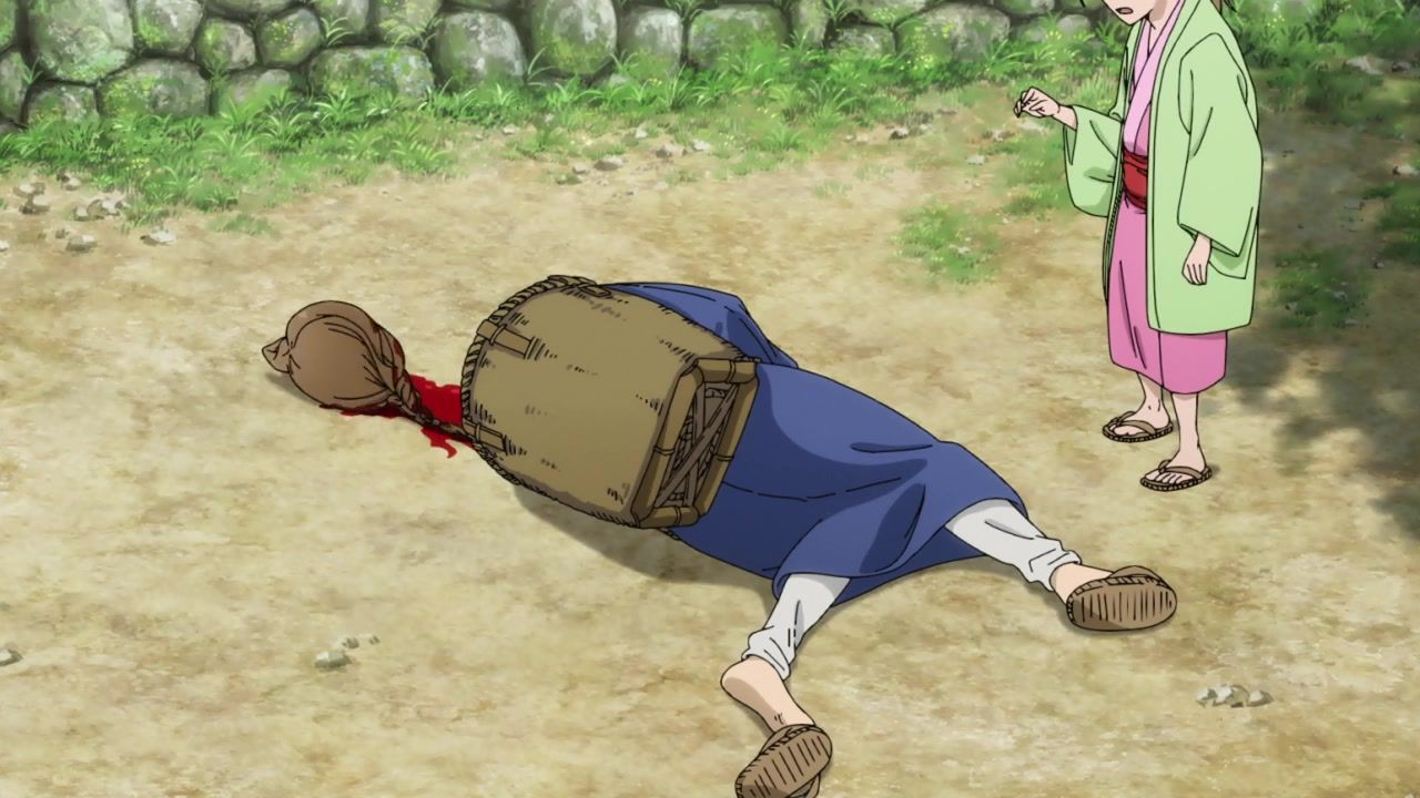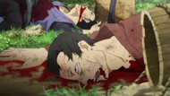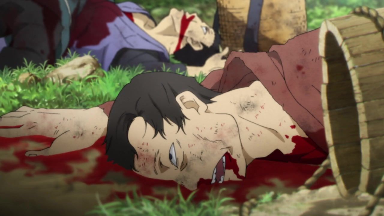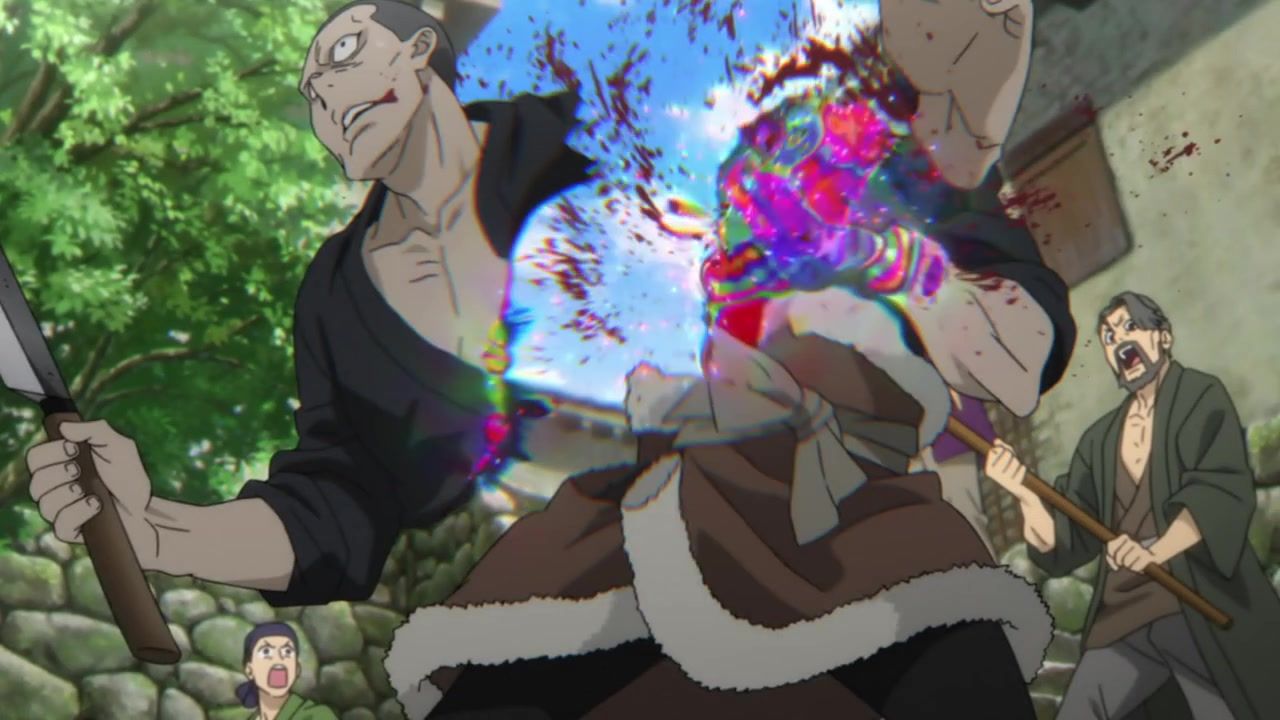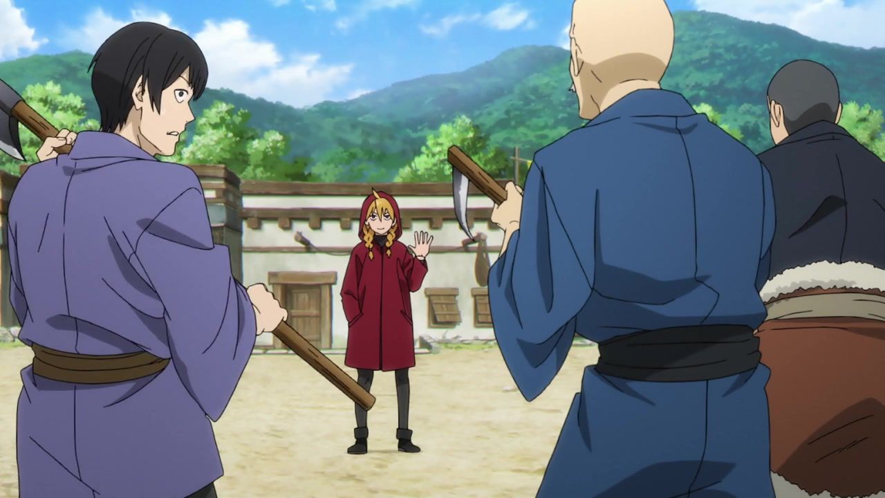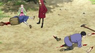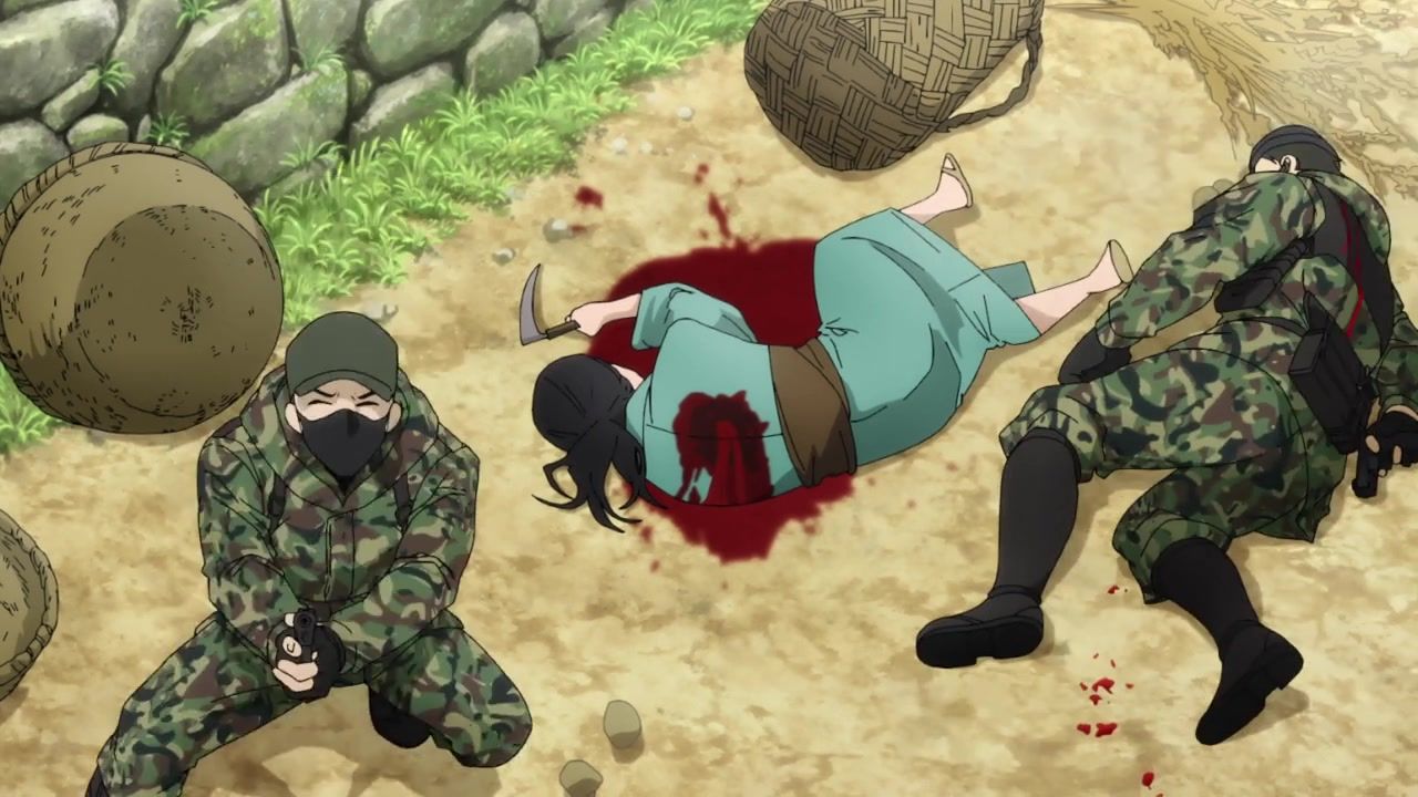 The awkwardness of the setting isn't improved much by the animation. Maybe the pacing of having it go from magical medieval village to everybody over five minutes instead of five pages helps a little bit, but you're still jumping right from gossipping about dragons to literally everybody leaping from helicopters while all the Truman Show villagers whip out glocks, but also magical teeth monsters bite everybody's heads off for some gratuitous villager jellification in order to meet its edgelord pre-reqs.