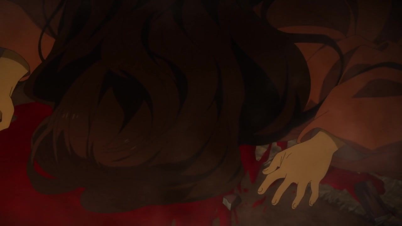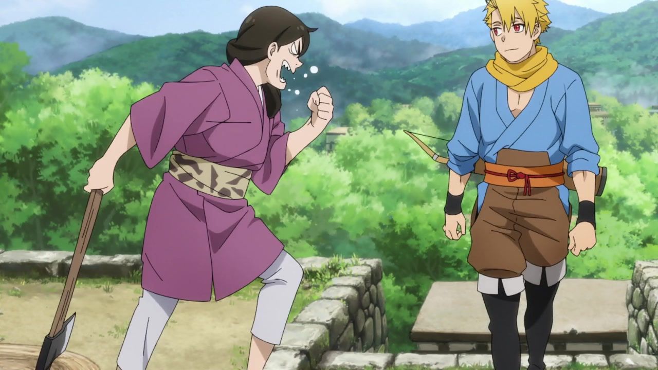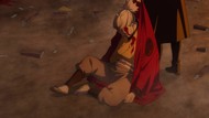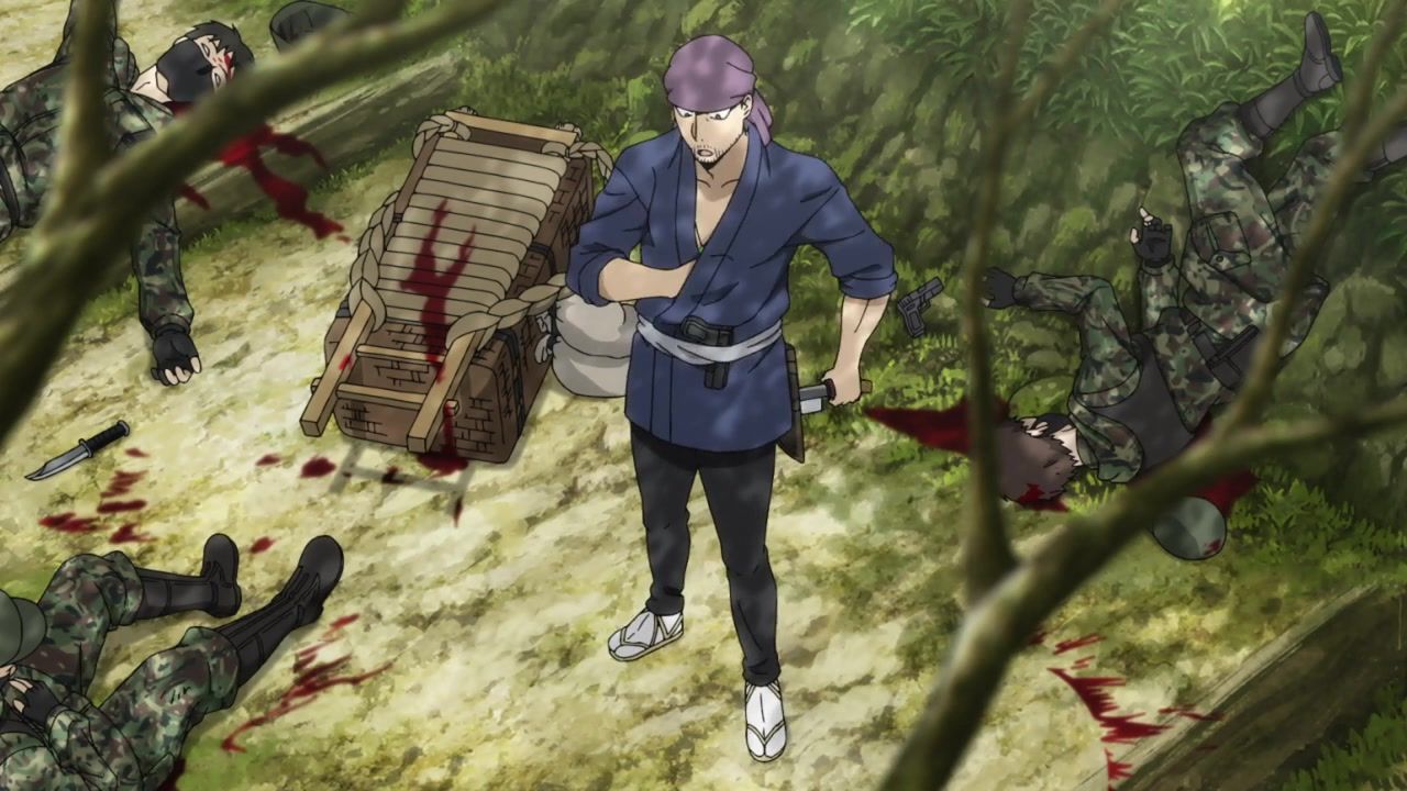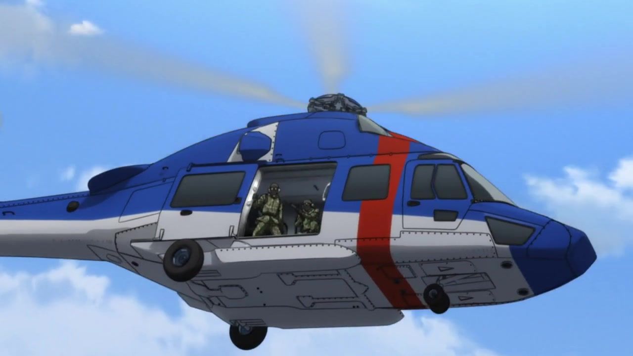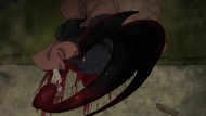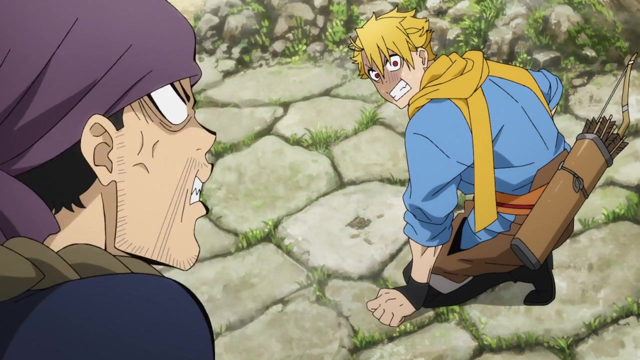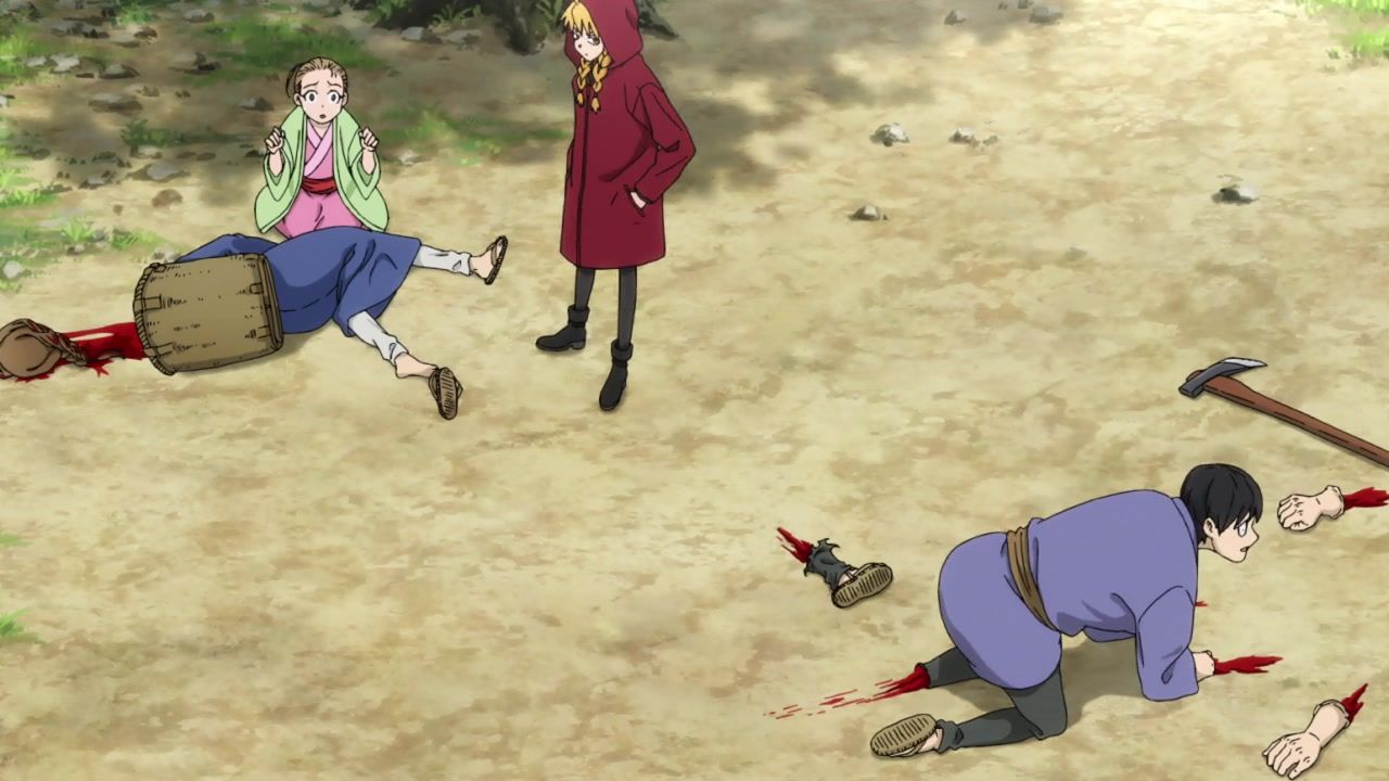 The awkwardness of the setting isn't improved much by the animation. Maybe the pacing of having it go from magical medieval village to everybody over five minutes instead of five pages helps a little bit, but you're still jumping right from gossipping about dragons to literally everybody leaping from helicopters while all the Truman Show villagers whip out glocks, but also magical teeth monsters bite everybody's heads off for some gratuitous villager jellification in order to meet its edgelord pre-reqs.