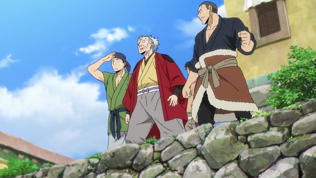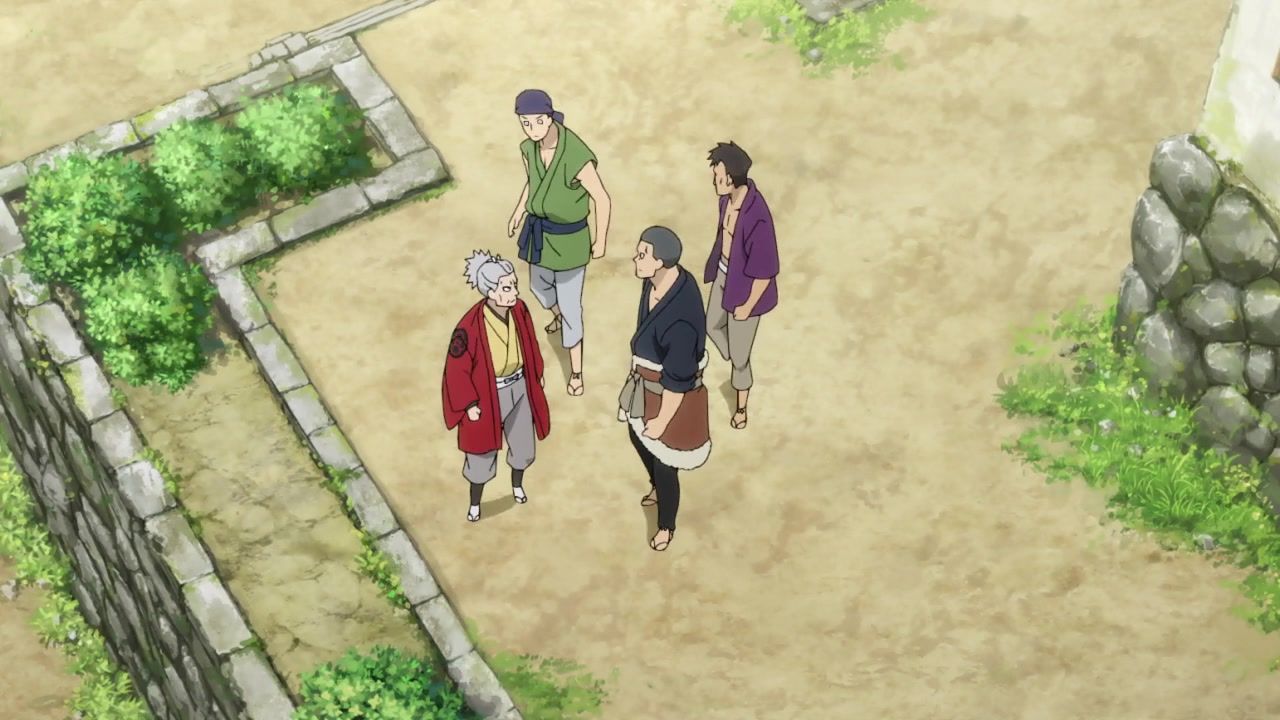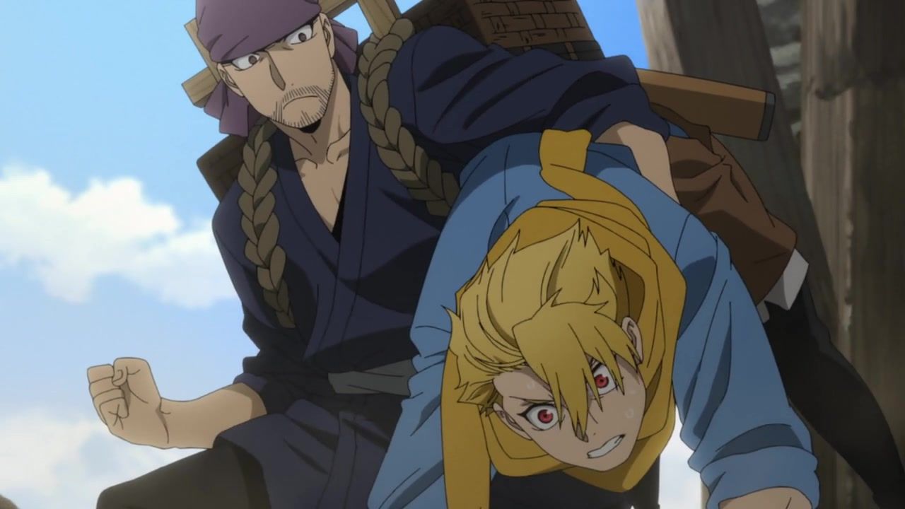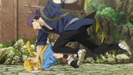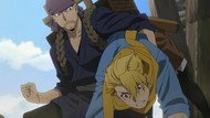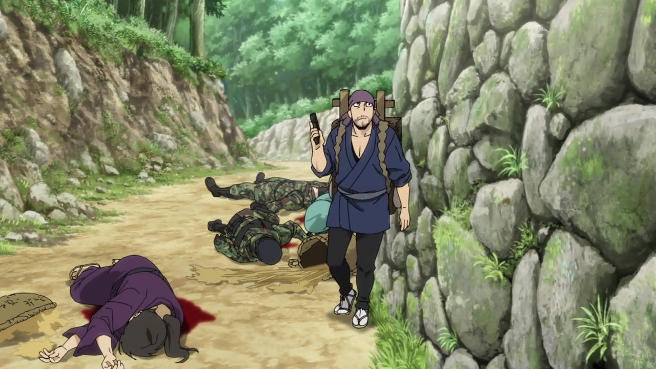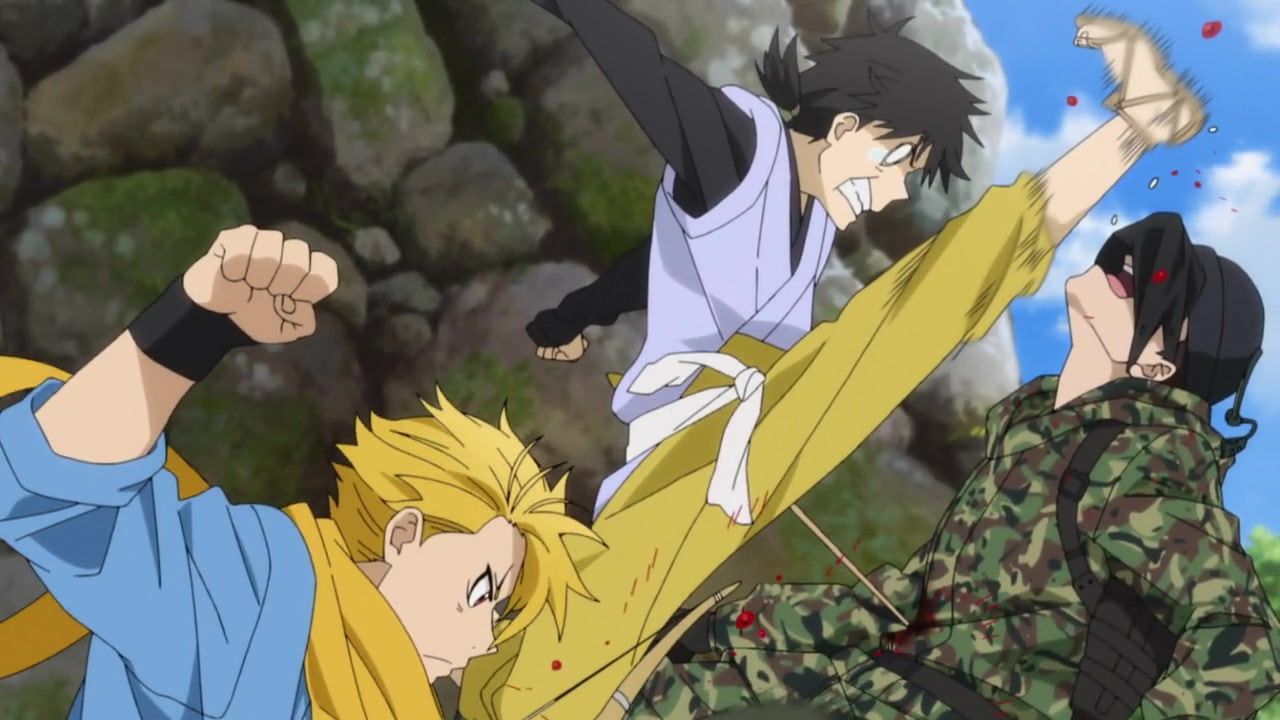 The awkwardness of the setting isn't improved much by the animation. Maybe the pacing of having it go from magical medieval village to everybody over five minutes instead of five pages helps a little bit, but you're still jumping right from gossipping about dragons to literally everybody leaping from helicopters while all the Truman Show villagers whip out glocks, but also magical teeth monsters bite everybody's heads off for some gratuitous villager jellification in order to meet its edgelord pre-reqs.