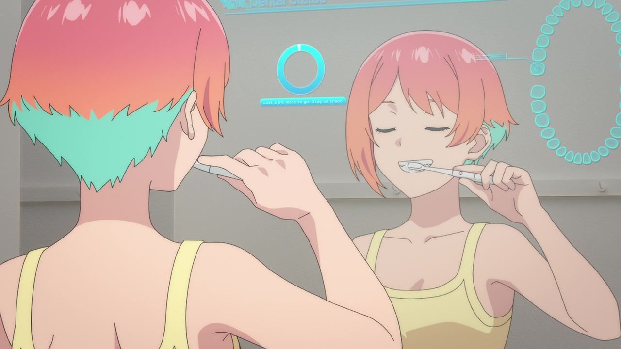 You know, a pretty solid twist on that corny-ass opening segment would have been revealing that it was all AI and the actual characters hated it for how utterly generic, overproduced, and lazy it was. Alas, no. That is the magic of music, and meant to be taken as the glory of idols singing about… the magic of music, and doing one's best, and how magical music is. Things get even more on the nose from there with some staggeringly poorly written exposition. "Boy, these parking regulations sure are strict." "Yes, that's because we live in a dystopian society, but strong laws keep the peace." "I am thankful for our dystopian society managed by AIs that have outlawed music." The best part was when Cleopatra fully took over, shut the idiot up, and just tried to sleep with every dude/stab every woman. Those are things I can get behind. It ends with another bizarre sequence where she tries to tell her friends what happened, but it turns out she's a magic girl, which means she's ultra cursed, and her evil aura makes her former friends start physically assaulting her, and so the drones crash in and laser them to death. Things went off the rails multiple times.