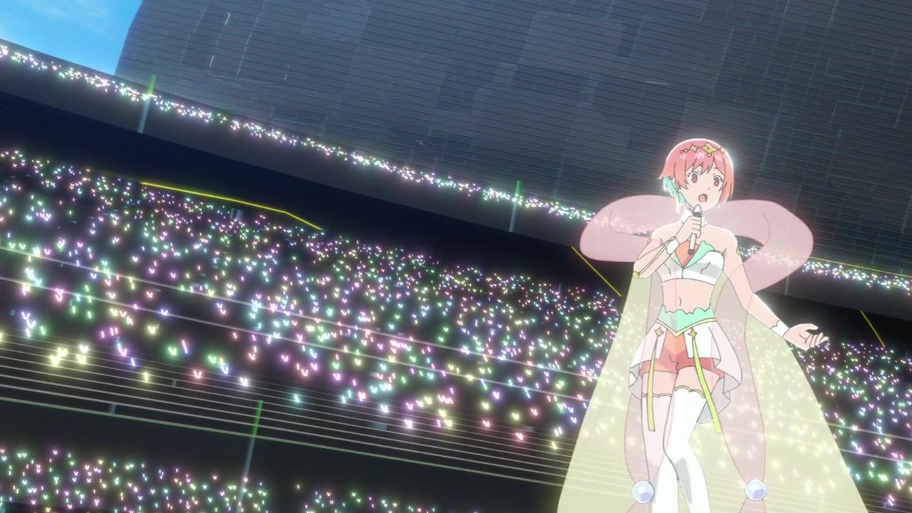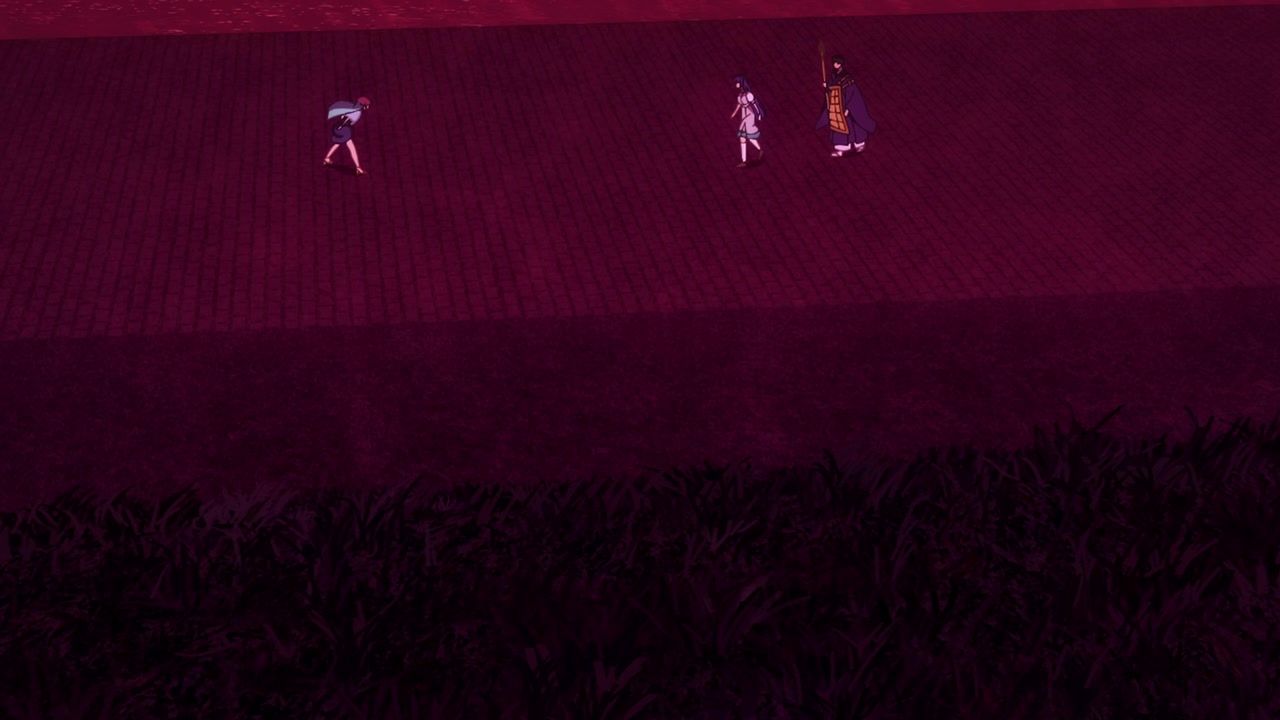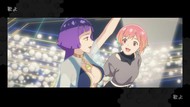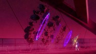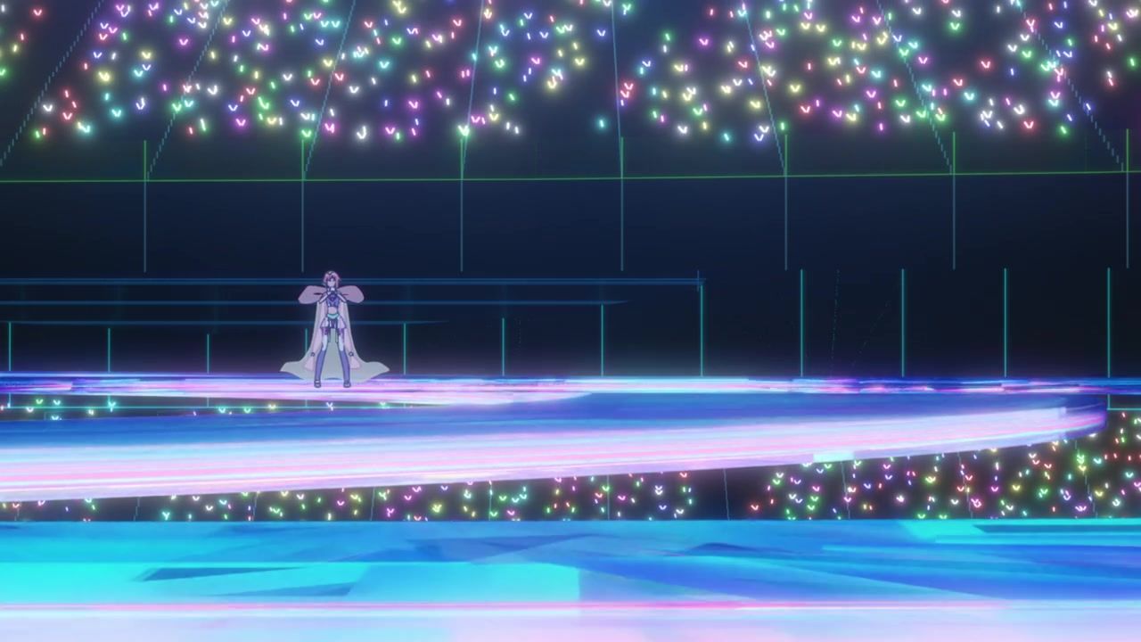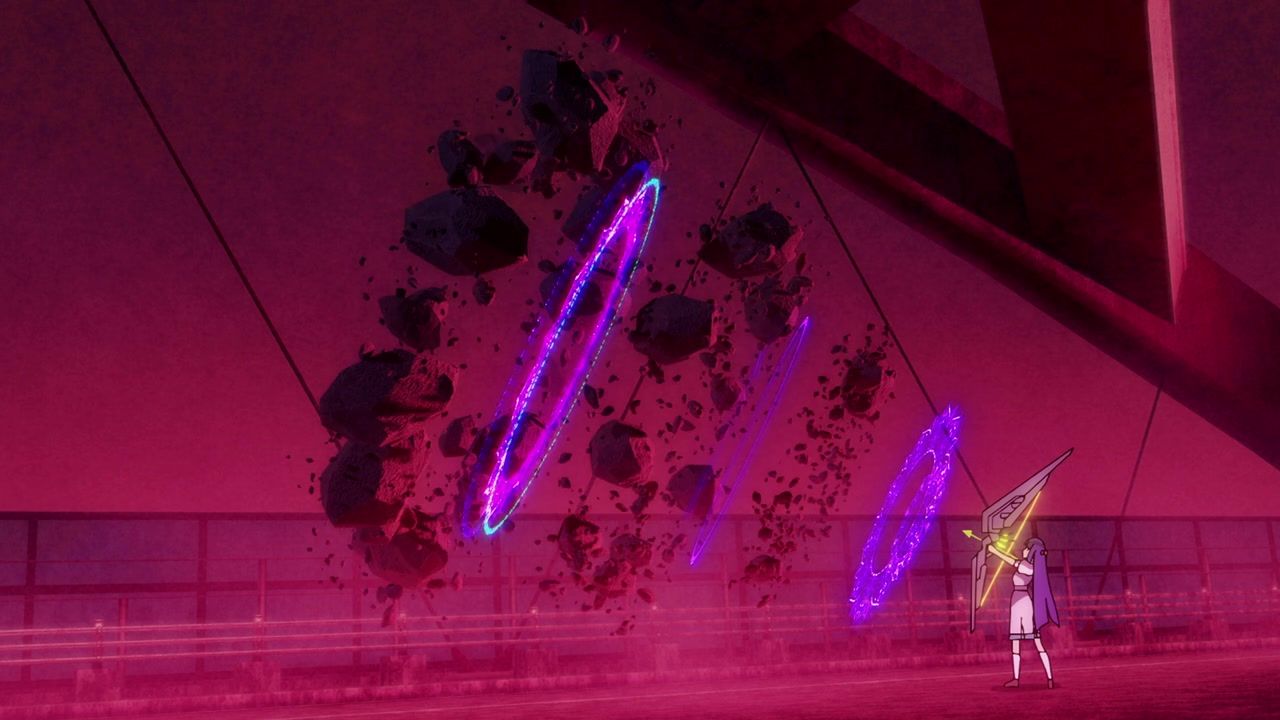 Then there's also what happens any time it actually tries to animate anything, which, oddly enough, didn't really include the opening concert. It… does not use CGI well. But it also doesn't use it consistently at all. She'll just spontaneously transform into CGI running down an alley, and then be right back to 2D animation in the next shot. But it also doesn't use it for when they start doing magical girl transformations and carpet bombing each other. But one summons rocks, and those are CGI. Then the Symphogear sequence starts, which I'm pretty sure is just a straight up advertisement for the crap this came from originally… but that's also barely animated despite the dramatic letterboxing and lyrics being printed on screen and looks like they probably literally just took a standard half-assed Vocaloid song like you'd see on Youtube and slapped that into the episode. It's baffling. Which sums up the whole episode, honestly.