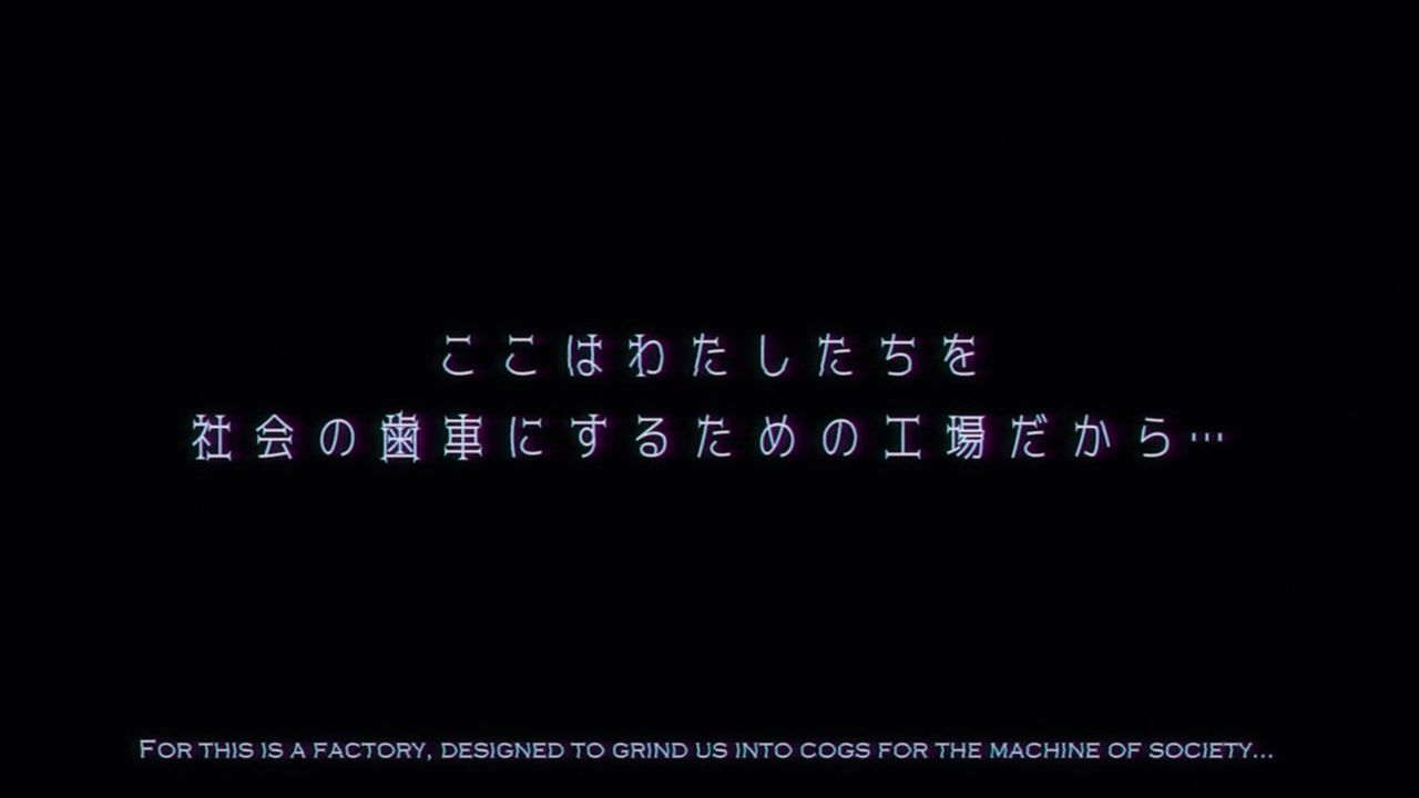 Uhhhh… huh. Well, they're certainly not shying away from the darker aspects of the origin game like the various censored versions that replaced hard drugs with magical candy. Including even one's boyfriend raping her. I'm not sure I could actually say what it is really going for though, aside from being disconcerting and edgy. More actually effectively edgy than most anime, which usually just go for people looking horrified at the camera. Lots of disturbing imagery, audio, quick cuts that keep you disoriented, so on and so forth.