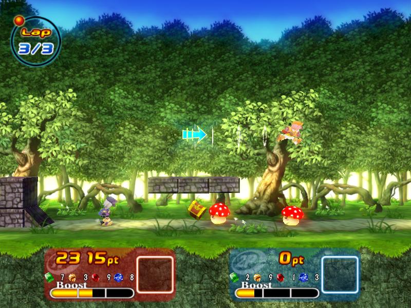 Yes, let us press any key. This one is pretty much exactly as expected, though a little heavier on the system resources than I’d have liked. My laptop grinds this one along as a stellar 30 FPS. The desktop handles it alright though. Anyway, you run along and ‘compete’ with the idiot AI, collecting gems, bouncing off of crap (and the AI) and occasionally throw giant fish at eachother. It’s nothing complex and your AI running buddy is simply terrible, so like many of EGS’ games, it’s probably best enjoyed with a friend. There are a wide variety of items to use against eachother, but mostly just variations on Mario Kart items. The hazards can get a little… dumb at times. I had no idea I had stepped on an oil patch until I was careening out of control into a wall. It looked like just another shadow to me. Not that bad from what I’ve played, but nowhere as nicely done as Recettear or Gunner’s Heart.